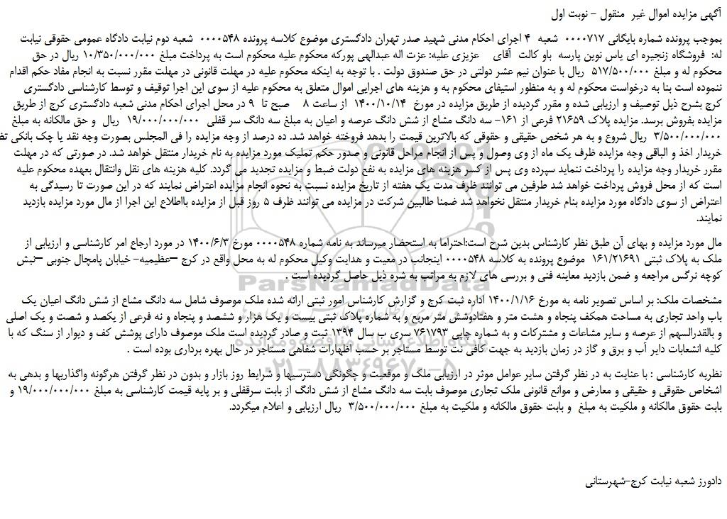 بموجب پرونده شماره بایگانی 0000717  شعبه  4 اجرای احکام مدنی شهید صدر تهران دادگستری موضوع کلاسه پرونده 0000548  شعبه دوم نیابت دادگاه عمومی حقوقی نیابت له:  فروشگاه زنجیره ای یاس نوین پارسه  باو کالت  آقای    عزیزی علیه: عزت اله عبدالهی پورکه محکوم علیه محکوم است به پرداخت مبلغ 10/350/000/000 ریال در حق محکوم له و مبلغ 517/500/000  ریال با عنوان نیم عشر دولتی در حق صندوق دولت . با توجه به اینکه محکوم علیه در مهلت قانونی در مهلت مقرر نسبت به انجام مفاد حکم اقدام ننموده است بنا به درخواست محکوم له و به منظور استیفای محکوم به و هزینه های اجرایی اموال متعلق به محکوم علیه از سوی این اجرا توقیف و توسط کارشناسی دادگستری کرج بشرح ذیل توصیف و ارزیابی شده و مقرر گردیده از طریق مزایده در مورخ  1400/10/14  از ساعت 8    صبح تا  9 در محل اجرای احکام مدنی شعبه دادگستری کرج از طریق مزایده بفروش برسد. مزایده پلاک 21659 فرعی از 161- سه دانگ مشاع از شش دانگ عرصه و اعیان به مبلغ سه دانگ سر قفلی  19/000/000/000  ریال  و حق مالکانه به مبلغ 3/500/000/000  ریال شروع و به هر شخص حقیقی و حقوقی که بالاترین قیمت را بدهد فروخته خواهد شد. ده درصد از وجه مزایده را فی المجلس بصورت وجه نقد یا چک بانکی تضمینی از خریدار اخذ و الباقی وجه مزایده ظرف یک ماه از وی وصول و پس از انجام مراحل قانونی و صدور حکم تملیک مورد مزایده به نام خریدار منتقل خواهد شد. در صورتی که در مهلت مقرر خریدار وجه مزایده را پرداخت ننماید سپرده وی پس از کسر هزینه های مزایده به نفع دولت ضبط و مزایده تجدید می گردد. کلیه هزینه های نقل وانتقال بعهده محکوم علیه است که از محل فروش پرداخت خواهد شد طرفین می توانند ظرف مدت یک هفته از تاریخ مزایده نسبت به نحوه انجام مزایده اعتراض نمایند که در این صورت تا رسیدگی به اعتراض از سوی دادگاه مورد مزایده بنام خریدار منتقل نخواهد شد ضمنا طالبین شرکت در مزایده می توانند ظرف 5 روز قبل از مزایده بااطلاع این اجرا از مال مورد مزایده بازدید نمایند.