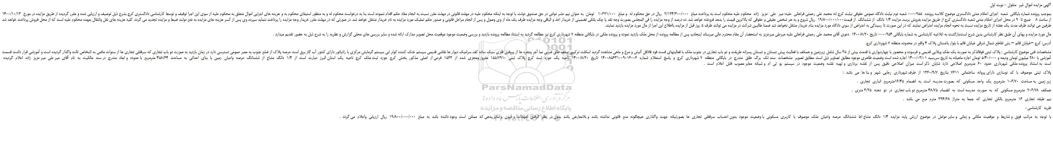 بموجب پرونده شماره بایگانی شعبه اجرای احکام مدنی دادگستری موضوع کلاسه پرونده 0000955 شعبه دوم نیابت دادگاه عمومی حقوقی نیابت کرج له: محمد علی رحمتی فراهانی علیه: میر علی عزیز زاده محکوم علیه محکوم است به پرداخت مبلغ 2/124/300/000 ریال در حق محکوم له و مبلغ 10621/000 تومان به عنوان نیم عشر دولتی در حق صندوق دولت. با توجه به اینکه محکوم علیه در مهلت قانونی در مهلت مقرر نسبت به انجام مفاد حکم اقدام ننموده است بنا به درخواست محکوم له و به منظور استیفای محکوم به و هزینه های اجرایی اموال متعلق به محکوم علیه از سوی این اجرا توقیف و توسط کارشناسی دادگستری کرج بشرح ذیل توصیف و ارزیابی شده و مقرر گردیده از طریق مزایده در مورخ 1400/10/13 از ساعت 8 صبح تا 9 در محل اجرای احکام مدنی شعبه دادگستری کرج از طریق مزایده بفروش برسد. مزایده 1/4 دانگ از ششدانگ از قیمت19/800/000/000 ریال شروع و به هر شخص حقیقی و حقوقی که بالاترین قیمت را بدهد فروخته خواهد شد. ده درصد از وجه مزایده را فی المجلس بصورت وجه نقد یا چک بانکی تضمینی از خریدار اخذ و الباقی وجه مزایده ظرف یک ماه از وی وصول و پس از انجام مراحل قانونی و صدور حکم تملیک مورد مزایده به نام خریدار منتقل خواهد شد. در صورتی که در مهلت مقرر خریدار وجه مزایده را پرداخت ننماید سپرده وی پس از کسر هزینه های مزایده به نفع دولت ضبط و مزایده تجدید می گردد. کلیه هزینه های نقل وانتقال بعهده محکوم علیه است که از محل فروش پرداخت خواهد شد طرفین می توانند ظرف مدت یک هفته از تاریخ مزایده نسبت به نحوه انجام مزایده اعتراض نمایند که در این صورت تا رسیدگی به اعتراض از سوی دادگاه مورد مزایده بنام خریدار منتقل نخواهد شد ضمنا طالبین شرکت در مزایده می توانند ظرف 5 روز قبل از مزایده بااطلاع این اجرا از مال مورد مزایده بازدید نمایند.