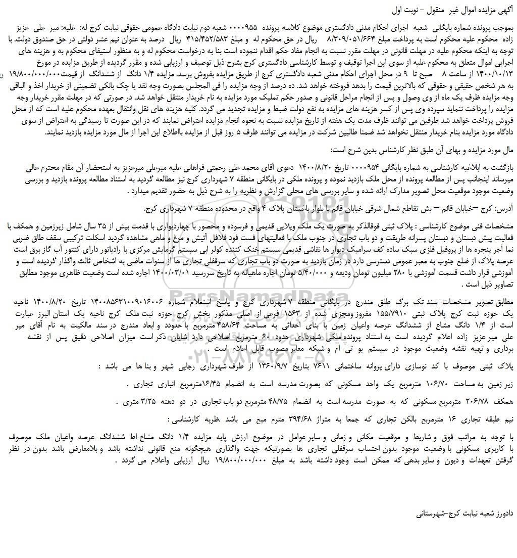 بموجب پرونده شماره بایگانی شعبه اجرای احکام مدنی دادگستری موضوع کلاسه پرونده 0000955 شعبه دوم نیابت دادگاه عمومی حقوقی نیابت کرج له: علیه: میر علی عزیز زاده محکوم علیه محکوم است به پرداخت مبلغ 8/309/051/664 ریال در حق محکوم له و مبلغ 415/452/583 ریال درصد به عنوان نیم عشر دولتی در حق صندوق دولت. با توجه به اینکه محکوم علیه در مهلت قانونی در مهلت مقرر نسبت به انجام مفاد حکم اقدام ننموده است بنا به درخواست محکوم له و به منظور استیفای محکوم به و هزینه های اجرایی اموال متعلق به محکوم علیه از سوی این اجرا توقیف و توسط کارشناسی دادگستری کرج بشرح ذیل توصیف و ارزیابی شده و مقرر گردیده از طریق مزایده در مورخ 1400/10/13 از ساعت 8 صبح تا 9 در محل اجرای احکام مدنی شعبه دادگستری کرج از طریق مزایده بفروش برسد. مزایده 1/4 دانگ از ششدانگ از قیمت19/800/000/000 ریال شروع و به هر شخص حقیقی و حقوقی که بالاترین قیمت را بدهد فروخته خواهد شد. ده درصد از وجه مزایده را فی المجلس بصورت وجه نقد یا چک بانکی تضمینی از خریدار اخذ و الباقی وجه مزایده ظرف یک ماه از وی وصول و پس از انجام مراحل قانونی و صدور حکم تملیک مورد مزایده به نام خریدار منتقل خواهد شد. در صورتی که در مهلت مقرر خریدار وجه مزایده را پرداخت ننماید سپرده وی پس از کسر هزینه های مزایده به نفع دولت ضبط و مزایده تجدید می گردد. کلیه هزینه های نقل وانتقال بعهده محکوم علیه است که از محل فروش پرداخت خواهد شد طرفین می توانند ظرف مدت یک هفته از تاریخ مزایده نسبت به نحوه انجام مزایده اعتراض نمایند که در این صورت تا رسیدگی به اعتراض از سوی دادگاه مورد مزایده بنام خریدار منتقل نخواهد شد ضمنا طالبین شرکت در مزایده می توانند ظرف 5 روز قبل از مزایده بااطلاع این اجرا از مال مورد مزایده بازدید نمایند.