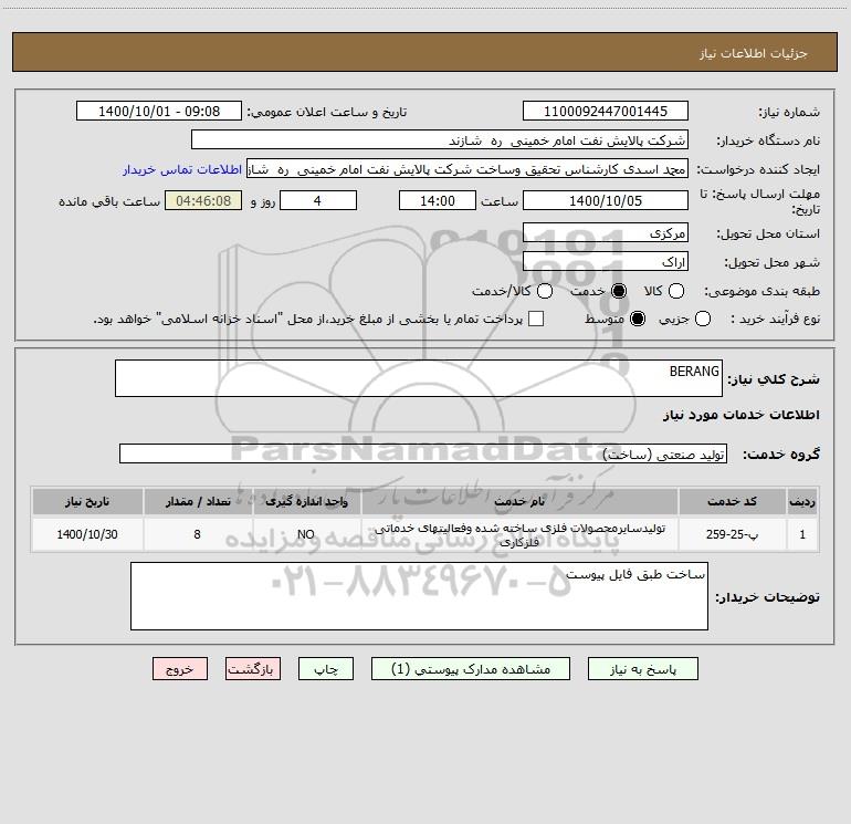 استعلام بها و موضوع استعلام استعلام BERANG به اطلاع کلیه شرکتها و افراد متخصص واجد شرایط میرساند، آگهی گذار در نظر دارد از طریق استعلام بها، نسبت به انتخاب و دریافت پیشنهادات اقدام نماید. این استعلام با کد آگهی ثبت شده در سامانه خبرگزاری پارس نماد : 4081145 منتشر شده است. مشخصات استعلام : تاریخ شروع استعلام: 1400/10/01 آخرین مهلت ارسال پیشنهاد قیمت : 1400/10/05 و محل اجرای پروژه : استان مرکزی میباشد. استعلام قیمت مورد درخواست : استعلام BERANG با دستهبندیهای تخصصی و گروه های مرتبط : انواع بلبرینگ و رولبرینگ, تجهیزات نفت و گاز, تجهیزات و ماشین آلات صنعتی, استعلام اطلاع رسانی میگردد.
