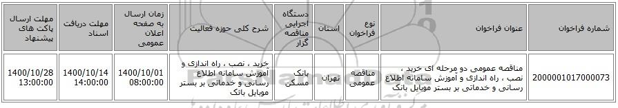 مناقصه، مناقصه عمومی دو مرحله ای خرید ، نصب ، راه اندازی و آموزش سامانه اطلاع رسانی و خدماتی بر بستر موبایل بانک, مناقصه عمومی دو مرحله ای خرید ، نصب ، راه اندازی و آموزش سامانه اطلاع رسانی و خدماتی بر بستر موبایل بانک