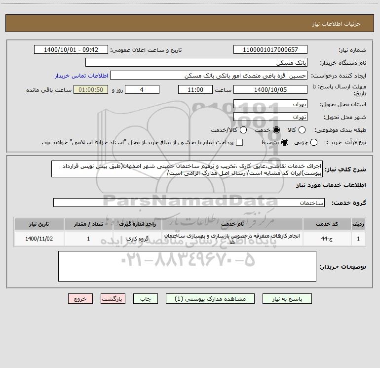 شرح کلی نیاز: اجرای خدمات نقاشی،عایق کاری ،تخریب و ترمیم ساختمان خمینی شهر اصفهان(طبق پیش نویس قرارداد پیوست)ایران کد مشابه است/ارسال اصل مدارک الزامی است/