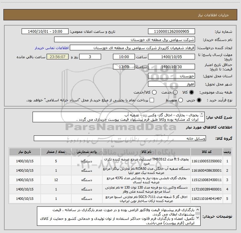 استعلام بها و موضوع استعلام استعلام یخچال - بخاری - اجاق گاز- وکس زن - تصفیه آب ایران کد مشابه بوده وکالا طبق فرم پیشنهاد قیمت پیوست خریداری می گردد . اب به اطلاع کلیه شرکتها و افراد متخصص واجد شرایط میرساند، آگهی گذار در نظر دارد از طریق استعلام بها، نسبت به انتخاب و دریافت پیشنهادات اقدام نماید. این استعلام با کد آگهی ثبت شده در سامانه خبرگزاری پارس نماد : 4081559 منتشر شده است. مشخصات استعلام : تاریخ شروع استعلام: 1400/10/01 آخرین مهلت ارسال پیشنهاد قیمت : 1400/10/04 و محل اجرای پروژه : استان خوزستان میباشد. استعلام قیمت مورد درخواست : استعلام یخچال - بخاری - اجاق گاز- وکس زن - تصفیه آب ایران کد مشابه بوده وکالا طبق فرم پیشنهاد قیمت پیوست خریداری می گردد . اب با دستهبندیهای تخصصی و گروه های مرتبط : تامین تجهیزات و احداث تصفیه خانه و ایستگاه پمپاژ, تجهیزات آب و فاضلاب, لوازم بهداشتی, لوازم خانگی, استعلام اطلاع رسانی میگردد.