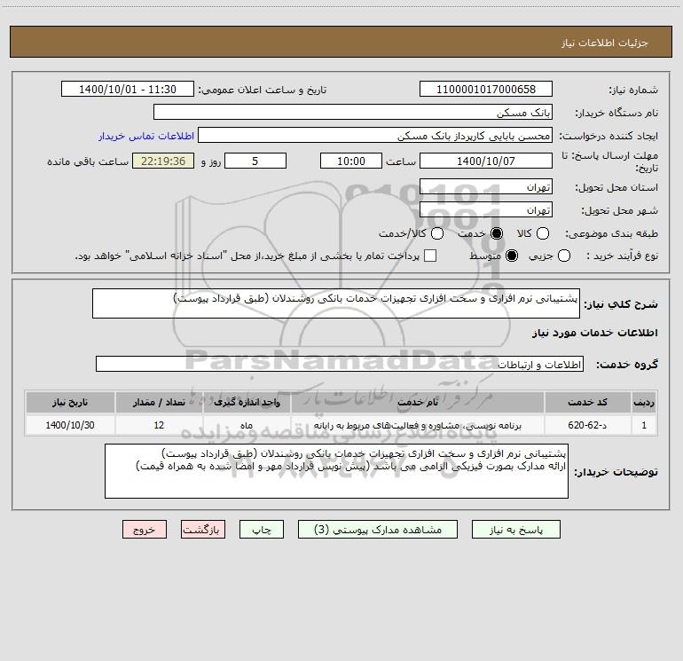 توضیحات خریدار:پشتیبانی نرم افزاری و سخت افزاری تجهیزات خدمات بانکی روشندلان (طبق قرارداد پیوست) ارائه مدارک بصورت فیزیکی الزامی می باشد (پیش نویس قرارداد مهر و امضا شده به همراه قیمت)