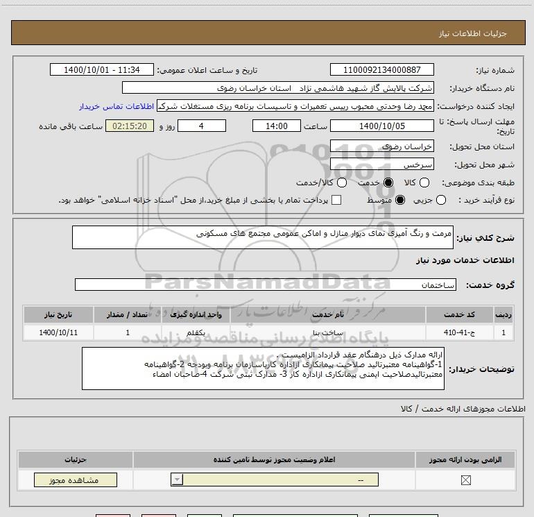 شرح کلی نیاز: مرمت و رنگ آمیزی نمای دیوار منازل و اماکن عمومی مجتمع های مسکونی