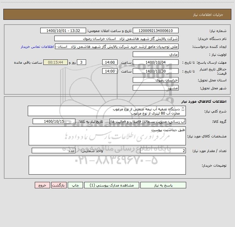 نام دستگاه خریدار:شرکت پالایش گاز شهید هاشمی نژاد استان خراسان رضوی