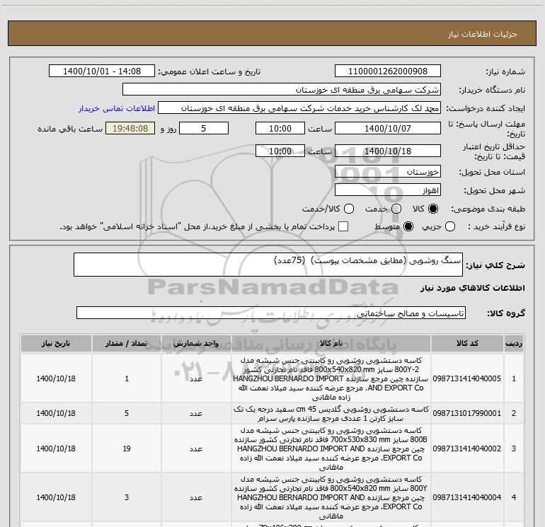 شرح کلی نیاز: سنگ روشویی (مطابق مشخصات پیوست) (75عدد)