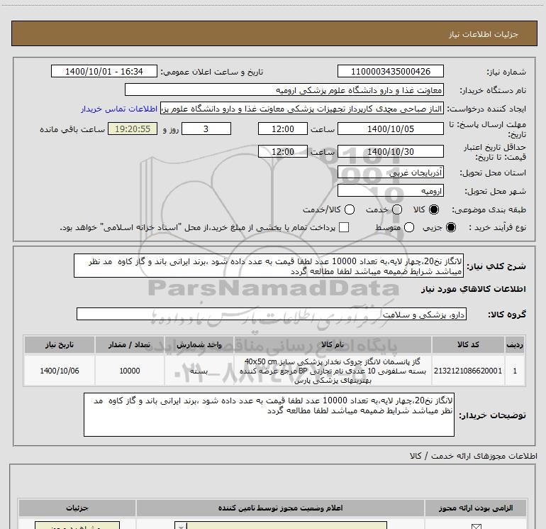 | 1 | 2132121086620001 | گاز پانسمان لانگاز چروک نخدار پزشکی سایز 40x50 cm بسته سلفونی 10 عددی نام تجارتی BP مرجع عرضه کننده بهترینهای پزشکی پارس | بسته | 10000 | 1400/10/06 |