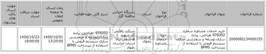 | 2000092134000153 | خرید خدمات مشاوره شماره 978352 طراحی، پیاده سازی،توسعه و سفارشی سازی سیستم فروش با استفاده از زیرساخت BPMS | خرید خدمات مشاوره | خراسان رضوی | شرکت پالایش گاز شهید هاشمی نژاد استان خراسان رضوی | 978352 -طراحی، پیاده سازی،توسعه و سفارشی سازی سیستم فروش با استفاده از زیرساخت BPMS | 1400/10/01 13:20:00 | 1400/10/23 19:00:00 |