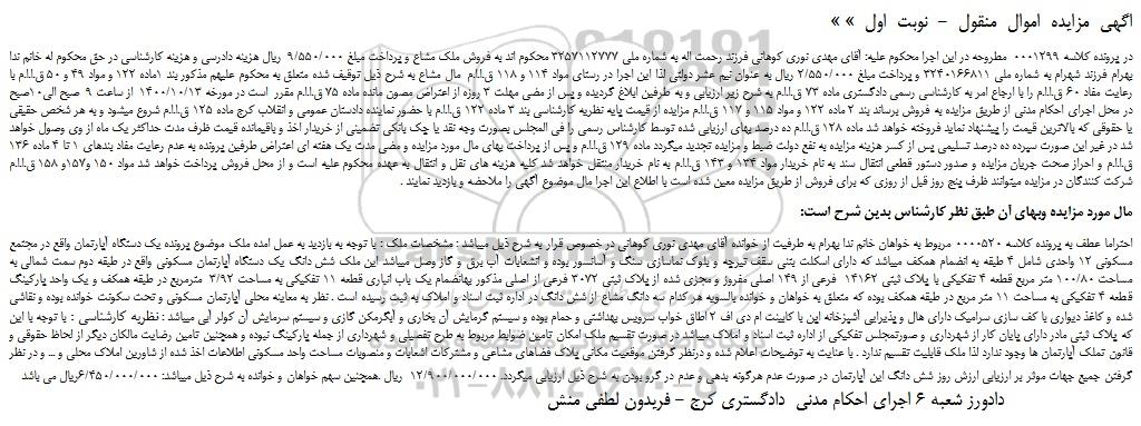 در پرونده کلاسه 0001299 مطروحه در این اجرا محکوم علیه: آقای مهدی نوری کوهانی فرزند رحمت اله به شماره ملی 3257112777 محکوم اند به فروش ملک مشاع و پرداخت مبلغ 9/550/000 ریال هزینه دادرسی و هزینه کارشناسی در حق محکوم له خانم ندا بهرام فرزند شهرام به شماره ملی 3240166811 و پرداخت مبلغ 2/550/000 ریال به عنوان نیم عشر دولتی لذا این اجرا در رستای مواد 114 و 118 ق.ا.ا.م مال مشاع به شرح ذیل توقیف شده متعلق به محکوم علیهم مذکور بند 1ماده 122 و مواد 49 و 50 ق.ا.ا.م با رعایت مفاد 60 ق.ا.ا.م را با ارجاع امر به کارشناسی رسمی دادگستری ماده 73 ق.ا.ا.م به شرح زیر ارزیابی و به طرفین ابلاغ گردیده و پس از مضی مهلت 3 روزه از اعتراض مصون مانده ماده 75 ق.ا.ا.م مقرر است در مورخه 1400/10/13 از ساعت 9 صبح الی10صبح در محل اجرای احکام مدنی از طریق مزایده به فروش برساند بند 2 ماده 122 و مواد 115 و 117 ق.ا.ا.م مزایده از قیمت پایه نظریه کارشناسی بند 3 ماده 122 ق.ا.ا.م با حضور نماینده دادستان عمومی و انقلاب کرج ماده 125 ق.ا.ا.م شروع میشود و به هر شخص حقیقی یا حقوقی که بالاترین قیمت را پیشنهاد نماید فروخته خواهد شد ماده 128 ق.ا.ا.م ده درصد بهای ارزیابی شده توسط کارشناس رسمی را فی المجلس بصورت وجه نقد یا چک بانکی تضمینی از خریدار اخذ و باقیمانده قیمت ظرف مدت حداکثر یک ماه از وی وصول خواهد شد در غیر این صورت سپرده ده درصد تسلیمی پس از کسر هزینه مزایده به نفع دولت ضبط و مزایده تجدید میگردد ماده 129 ق.ا.ا.م و پس از پرداخت بهای مال مورد مزایده و مضی مدت یک هفته ای اعتراض طرفین پرونده به عدم رعایت مفاد بندهای 1 تا 4 ماده 136 ق.ا.ا.م و احراز صحت جریان مزایده و صدور دستور قطعی انتقال سند به نام خریدار مواد 134 و 143 ق.ا.ا.م به نام خریدار منتقل خواهد شد کلیه هزینه های نقل و انتقال به عهده محکوم علیه است و از محل فروش پرداخت خواهد شد مواد 150 و157و 158 ق.ا.ا.م شرکت کنندگان در مزایده میتوانند ظرف پنج روز قبل از روزی که برای فروش از طریق مزایده معین شده است با اطلاع این اجرا مال موضوع آگهی را ملاحضه و بازدید نمایند .