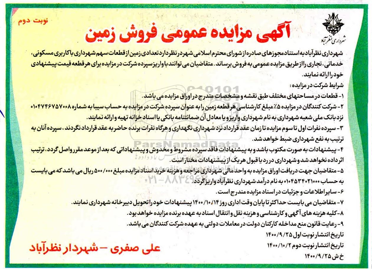 مزایده عمومی مزایده فروش تعدادی زمین از قطعات سهم شهرداری مسکونی و خدماتی نوبت دوم برگزار میگردد. از کلیه افراد متخصص و شرکتهای واجد شرایط دعوت به عمل میآید تا در این مزایده با کد خبرگزاری پارس نماد : 4084695 شرکت نمایند تاریخ شروع مزایده : 1400/10/02 مهلت شرکت در مزایده: تا پایان روز 1400/10/14 مکان برگزاری اموال واگذاری استانهای البرز و دستهبندیهای مربوط به این حراجی املاک و زمین میباشد.
