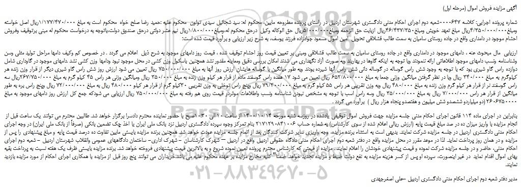 شماره پرونده اجرایی: کلاسه 0000647شعبه دوم اجرای احکام مدنی دادگستری شهرستان اردبیل در راستای پرونده مطروحه مابین، محکوم له: سید شجائیل سیدی تولون محکوم علیه :حمید رضا صلح خواه محکوم است به مبلغ 1/177/470/000ریال اصل خواسته ومبلغ4/350/000/000ریال مبلغ تعهد خویش ومبلغ46/437/350ریال ازبابت حق الزحمه ومبلغ5/000/000ریال حق الوکاله وکیل درحق محکوم له،ومبلغ1/800/000ریال نیم عشر دولتی درحق صندوق دولت،باتوجه به درخواست محکوم له مبنی برتوقیف وفروش احشام موجود در دامداری واقع در جاده روستای سامیان به سمت طالب قشلاقی تحویل امین اموال مسعود جوادزاده فرزند یوسف، به شرح زیر ارزیابی و برآورد قیمت شده است؛