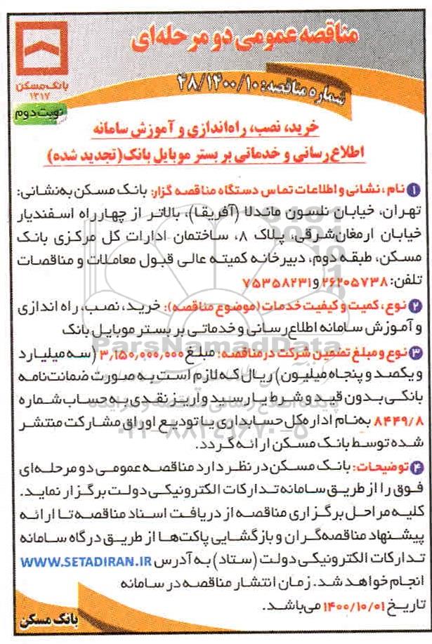 خرید، نصب، راه اندازی و آموزش سامانه اطلاع رسانی و خدماتی بر بستر موبایل بانک (تجدید شده)