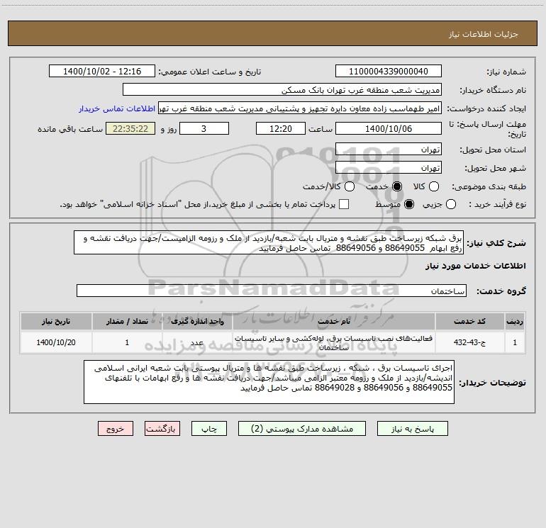 شرح کلی نیاز: برق شبکه زیرساخت طبق نقشه و متریال بابت شعبه/بازدید از ملک و رزومه الزامیست/جهت دریافت نقشه و رفع ابهام 88649055 و 88649056 تماس حاصل فرمایید