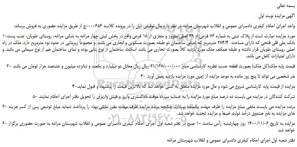 6- مزایده به تاریخ 1400/11/06 روز چهارشنبه رأس ساعت 10 صبح در دفتر شعبه اول اجرای احکام کیفری دادسرای عمومی و انقلاب شهرستان مراغه به صورت حضوری برگزار خواهد شد.