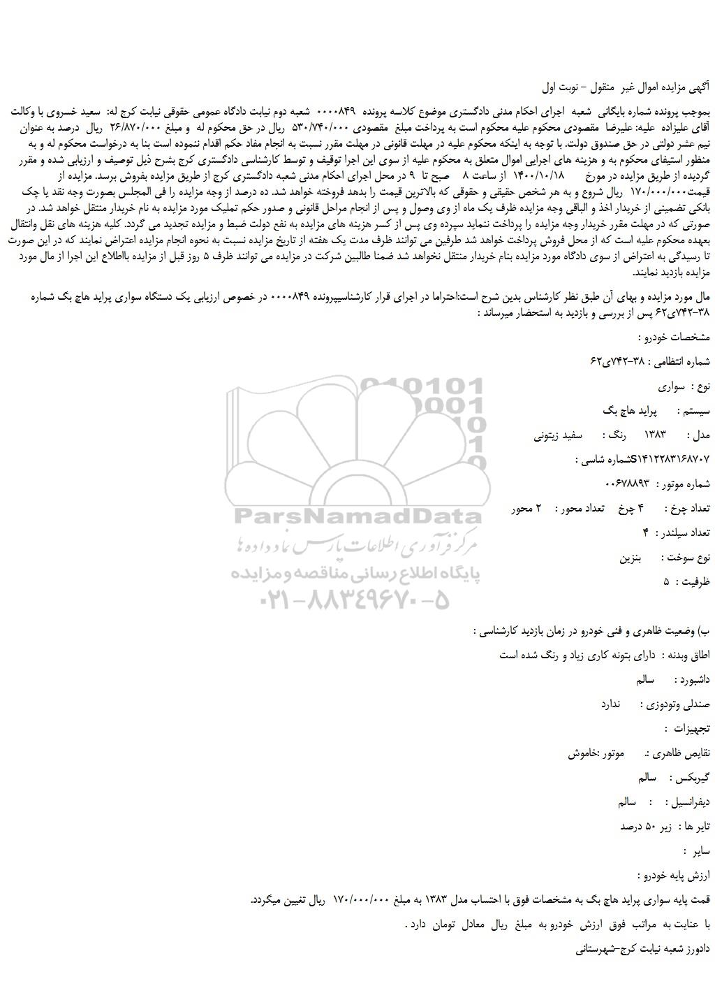 مال مورد مزایده و بهای آن طبق نظر کارشناس بدین شرح است:احتراما در اجرای قرار کارشناسیپرونده 0000849 در خصوص ارزیابی یک دستگاه سواری پراید هاچ بگ شماره 38-742ی62 پس از بررسی و بازدید به استحضار میرساند :
