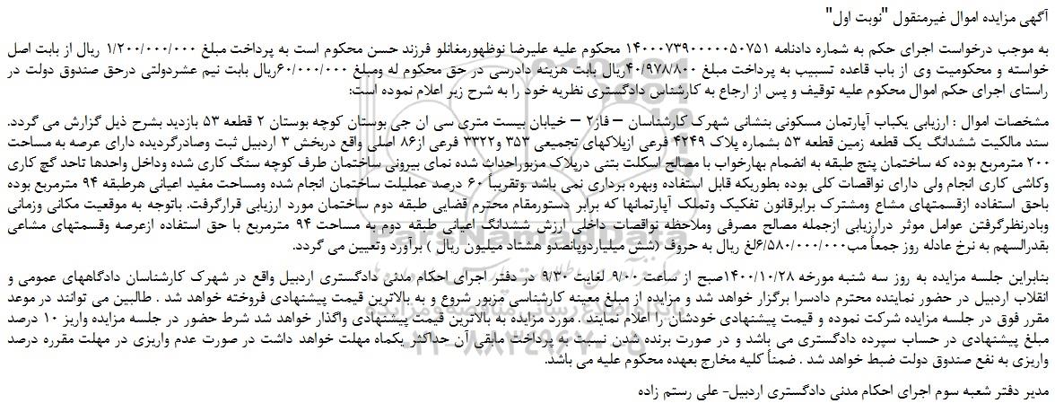 به موجب درخواست اجرای حکم به شماره دادنامه 140007390000050751 محکوم علیه علیرضا نوظهورمغانلو فرزند حسن محکوم است به پرداخت مبلغ 1/200/000/000 ریال از بابت اصل خواسته و محکومیت وی از باب قاعده تسبیب به پرداخت مبلغ 40/978/800ریال بابت هزینه دادرسی در حق محکوم له ومبلغ 60/000/000ریال بابت نیم عشردولتی درحق صندوق دولت در راستای اجرای حکم اموال محکوم علیه توقیف و پس از ارجاع به کارشناس دادگستری نظریه خود را به شرح زیر اعلام نموده است:
