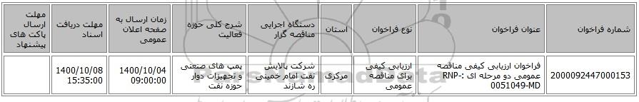 مناقصه، فراخوان ارزیابی کیفی مناقصه عمومی دو مرحله ای :RNP-0051049-MD, فراخوان ارزیابی کیفی مناقصه عمومی دو مرحله ای :RNP-0051049-MD