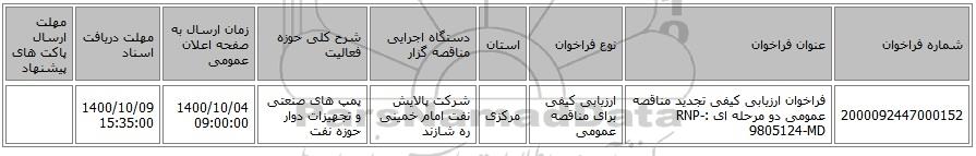 مناقصه، فراخوان ارزیابی کیفی تجدید مناقصه عمومی دو مرحله ای :RNP-9805124-MD, فراخوان ارزیابی کیفی تجدید مناقصه عمومی دو مرحله ای :RNP-9805124-MD