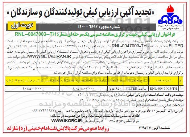 فراخوان ارزیابی کیفی جهت برگزاری مناقصه عمومی یک مرحله ای شماره RNL-0047003-TH شرکت پالایش نفت امام خمینی (ره) در نظر دارد فراخوان ارزیابی کیفی جهت برگزاری مناقصه عمومی یک مرحله ای ساخت FILTER به شماره مناقصه RNL-0047003-TH و شماره فراخوان 2000092447000146 را از طریق سامانه تدارکات الکترونیکی دولت برگزار نماید. کلیه مراحل برگزاری فراخوان ارزیابی کیفی از دریافت و تحویل اسناد استعلام ارزیابی کیفی تا ارسال دعوتنامه جهت سایر مراحل مناقصه از طریق درگاه سامانه تدارکات الکترونیکی دولت ستاد ایران انجام خواهد شد. لازم است مناقصه گران در صورت عدم عضویت قبلی مراحل ثبت نام در سایت مذکور و دریافت گواهی امضای الکترونیکی را جهت شرکت در مناقصه محقق سازند. تاریخ انتشار فراخوان در سامانه تاریخ 1400.10.04 می باشد. اطلاعات و اسناد مناقصه عمومی پس از برگزاری فرآیند ارزیابی کیفی و ارسال دعوتنامه از طریق سامانه ستاد به مناقصه گران ارسال خواهد شد.