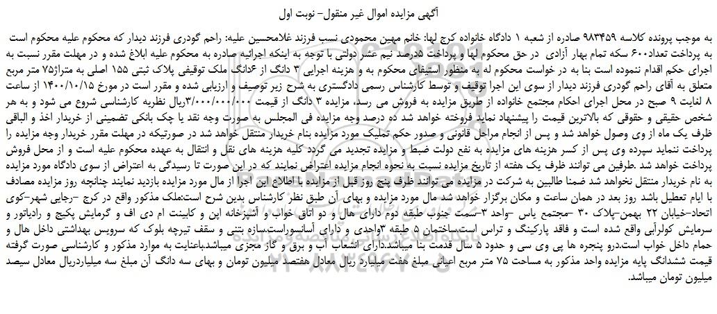 به موجب پرونده کلاسه 983459 صادره از شعبه 1 دادگاه خانواده کرج لها: خانم مهین محمودی نسب فرزند غلامحسین علیه: راحم گودری فرزند دیدار که محکوم علیه محکوم است به پرداخت تعداد600 سکه تمام بهار آزادی در حق محکوم لها و پرداخت 5درصد نیم عشر دولتی با توجه به اینکه اجرائیه صادره به محکوم علیه ابلاغ شده و در مهلت مقرر نسبت به اجرای حکم اقدام ننموده است بنا به در خواست محکوم له به منظور استیفای محکوم به و هزینه اجرایی 3 دانگ از 6دانگ ملک توقیفی پلاک ثبتی 155 اصلی به متراژ75 متر مربع متعلق به آقای راحم گودری فرزند دیدار از سوی این اجرا توقیف و توسط کارشناس رسمی دادگستری به شرح زیر توصیف و ارزیابی شده و مقرر است در مورخ 1400/10/15 از ساعت 8 لغایت 9 صبح در محل اجرای احکام مجتمع خانواده از طریق مزایده به فروش می رسد، مزایده 3 دانگ از قیمت 3/000/000/000ریال نظریه کارشناسی شروع می شود و به هر شخص حقیقی و حقوقی که بالاترین قیمت را پیشنهاد نماید فروخته خواهد شد ده درصد وجه مزایده فی المجلس به صورت وجه نقد یا چک بانکی تضمینی از خریدار اخذ و الباقی ظرف یک ماه از وی وصول خواهد شد و پس از انجام مراحل قانونی و صدور حکم تملیک مورد مزایده بنام خریدار منتقل خواهد شد در صورتیکه در مهلت مقرر خریدار وجه مزایده را پرداخت ننماید سپرده وی پس از کسر هزینه های مزایده به نفع دولت ضبط و مزایده تجدید می گردد کلیه هزینه های نقل و انتقال به عهده محکوم علیه است و از محل فروش پرداخت خواهد شد .طرفین می توانند ظرف یک هفته از تاریخ مزایده نسبت به نحوه انجام مزایده اعتراض نمایند که در این صورت تا رسیدگی به اعتراض از سوی دادگاه مورد مزایده به نام خریدار منتقل نخواهد شد ضمنا طالبین به شرکت در مزایده می توانند ظرف پنج روز قبل از مزایده با اطلاع این اجرا از مال مورد مزایده بازدید نمایند چنانچه روز مزایده مصادف با ایام تعطیل باشد روز بعد در همان ساعت و مکان برگزار خواهد شد مال مورد مزایده و بهای آن طبق نظر کارشناس بدین شرح است:ملک مذکور واقع در کرج -رجایی شهر-کوی اتحاد-خیابان 22 بهمن-پلاک 30 -مجتمع یاس -واحد 3-سمت جنوب طبقه دوم دارای هال و دو اتاق خواب و آشپزخانه اپن و کابینت ام دی اف و گرمایش پکیج و رادیاتور و سرمایش کولرآبی واقع شده است و فاقد پارکینگ و تراس است.ساختمان 5 طبقه 3واحدی و دارای آسانسوراست.سازه بتنی و سقف تیرچه بلوک که سرویس بهداشتی داخل هال و حمام داخل خواب است.درو پنجره ها پی وی سی و حدود 5 سال قدمت بنا میباشد.دارای انشعاب آب و برق و گاز مجزی میباشد.باعنایت به موارد مذکور و کارشناسی صورت گرفته قیمت ششدانگ پایه مزایده واحد مذکور به مساحت 75 متر مربع اعیانی مبلغ هفت میلیارد ریال معادل هفتصد میلیون تومان و بهای سه دانگ آن مبلغ سه میلیاردریال معادل سیصد میلیون تومان میباشد.