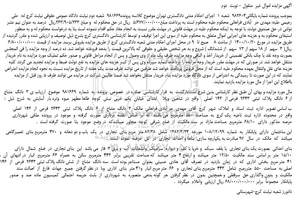 بموجب پرونده شماره بایگانی982604 شعبه 1 اجرای احکام مدنی دادگستری تهران موضوع کلاسه پرونده981669 شعبه دوم نیابت دادگاه عمومی حقوقی نیابت کرج له: علی رحیمی علیه: مهدی حر آبادی فراهانی محکوم علیه محکوم است به پرداخت مبلغ5/677/000/000 ریال در حق محکوم له و مبلغ 263/905/233ریال درصد به عنوان نیم عشر دولتی در حق صندوق دولت. با توجه به اینکه محکوم علیه در مهلت قانونی در مهلت مقرر نسبت به انجام مفاد حکم اقدام ننموده است بنا به درخواست محکوم له و به منظور استیفای محکوم به و هزینه های اجرایی اموال متعلق به محکوم علیه از سوی این اجرا توقیف و توسط کارشناسی دادگستری کرج بشرح ذیل توصیف و ارزیابی شده و مقرر گردیده از طریق مزایده در مورخ 1400/10/20 از ساعت 8 صبح تا 9 در محل اجرای احکام مدنی شعبه دادگستری کرج از طریق مزایده بفروش برسد. مزایده از قیمت 6/800/000/000 ریال( 3 سهم از 18 سهم از 72 سهم از ششدانگ ) شروع و به هر شخص حقیقی و حقوقی که بالاترین قیمت را بدهد فروخته خواهد شد. ده درصد از وجه مزایده را فی المجلس بصورت وجه نقد یا چک بانکی تضمینی از خریدار اخذ و الباقی وجه مزایده ظرف یک ماه از وی وصول و پس از انجام مراحل قانونی و صدور حکم تملیک مورد مزایده به نام خریدار منتقل خواهد شد. در صورتی که در مهلت مقرر خریدار وجه مزایده را پرداخت ننماید سپرده وی پس از کسر هزینه های مزایده به نفع دولت ضبط و مزایده تجدید می گردد. کلیه هزینه های نقل وانتقال بعهده محکوم علیه است که از محل فروش پرداخت خواهد شد طرفین می توانند ظرف مدت یک هفته از تاریخ مزایده نسبت به نحوه انجام مزایده اعتراض نمایند که در این صورت تا رسیدگی به اعتراض از سوی دادگاه مورد مزایده بنام خریدار منتقل نخواهد شد ضمنا طالبین شرکت در مزایده می توانند ظرف 5 روز قبل از مزایده بااطلاع این اجرا از مال مورد مزایده بازدید نمایند.