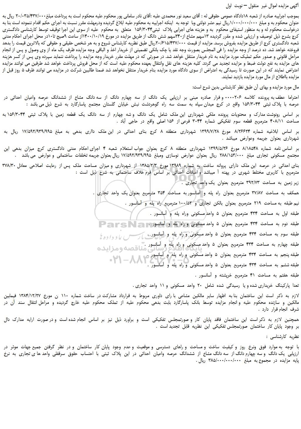 بموجب اجراییه صادره از شعبه 18دادگاه عمومی حقوقی له : آقای سعید نور محمدی علیه :آقای نادر سامانی پور محکوم علیه محکوم است به پرداخت مبلغ20/035/437/000 ریال به عنوان محکوم به و مبلغ 1/000/000/000ریال نیم عشر دولتی وبا توجه به اینکه اجراییه به محکوم علیه ابلاغ گردیده ودرمهلت مقرر نسبت به اجرای حکم اقدام ننموده است بنا به درخواست محکوم له و به منظور استیفای محکوم به و هزینه های اجرایی پلاک ثبتی156/3044 متعلق به محکوم علیه از سوی این اجرا توقیف توسط کارشناسی دادگستری کرج بشرح ذیل توصیف و ارزیابی شده و مقرر گردیده 13سهم مشاع از240سهم شش دانگ از طریق مزایده در مورخ 1400/10/19از ساعت 9صبح تا10در محل اجرای احکام مدنی شعبه دادگستری کرج از طریق مزایده بفروش برسد. مزایده از قیمت 20/615/437/000ریال طبق نظریه کارشناس شروع و به هر شخص حقیقی و حقوقی که بالاترین قیمت را بدهد فروخته خواهد شد. ده درصد از وجه مزایده را فی المجلس بصورت وجه نقد یا چک بانکی تضمینی از خریدار اخذ و الباقی وجه مزایده ظرف یک ماه از وی وصول و پس از انجام مراحل قانونی و صدور حکم تملیک مورد مزایده به نام خریدار منتقل خواهد شد. در صورتی که در مهلت مقرر خریدار وجه مزایده را پرداخت ننماید سپرده وی پس از کسر هزینه های مزایده به نفع دولت ضبط و مزایده تجدید می گردد. کلیه هزینه های نقل وانتقال بعهده محکوم علیه است که از محل فروش پرداخت خواهد شد طرفین می توانند مزایده اعتراض نمایند که در این صورت تا رسیدگی به اعتراض از سوی دادگاه مورد مزایده بنام خریدار منتقل نخواهد شد ضمنا طالبین شرکت در مزایده می توانند ظرف 5 روز قبل از مزایده بااطلاع از مال مورد مزایده بازدید نمایند.