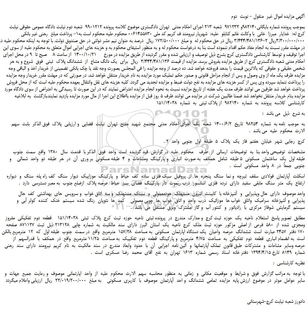 بموجب پرونده شماره بایگانی982140و 971232 شعبه 213 اجرای احکام مدنی تهران دادگستری موضوع کلاسه پرونده 9901212 شعبه دوم نیابت دادگاه عمومی حقوقی نیابت کرج له: خدایار میرزا خانی با وکالت خانم کتابلو علیه: شهریار نیرومند ف کریم کد ملی 0061455830 محکوم علیه محکوم است به1- پرداخت مبلغ رهنی غیر بانکی 3/300/000/000ریال 2-3/444/481/136 ریال در حق محکوم له و مبلغ 172/500/000 ریال درصد به عنوان نیم عشر دولتی در حق صندوق دولت. با توجه به اینکه محکوم علیه در مهلت قانونی در مهلت مقرر نسبت به انجام مفاد حکم اقدام ننموده است بنا به درخواست محکوم له و به منظور استیفای محکوم به و هزینه های اجرایی اموال متعلق به محکوم علیه از سوی این اجرا توقیف و توسط کارشناسی دادگستری کرج بشرح ذیل توصیف و ارزیابی شده و مقرر گردیده از طریق مزایده در مورخ 1400/10/21 از ساعت 8 صبح تا 9 در محل اجرای احکام مدنی شعبه دادگستری کرج از طریق مزایده بفروش برسد. مزایده از قیمت 3/444/481/136 ریال برای یک دانگ مشاع از ششدانگ پلاک ثبتی فوق شروع و به هر شخص حقیقی و حقوقی که بالاترین قیمت را بدهد فروخته خواهد شد. ده درصد از وجه مزایده را فی المجلس بصورت وجه نقد یا چک بانکی تضمینی از خریدار اخذ و الباقی وجه مزایده ظرف یک ماه از وی وصول و پس از انجام مراحل قانونی و صدور حکم تملیک مورد مزایده به نام خریدار منتقل خواهد شد. در صورتی که در مهلت مقرر خریدار وجه مزایده را پرداخت ننماید سپرده وی پس از کسر هزینه های مزایده به نفع دولت ضبط و مزایده تجدید می گردد. کلیه هزینه های نقل وانتقال بعهده محکوم علیه است که از محل فروش پرداخت خواهد شد طرفین می توانند ظرف مدت یک هفته از تاریخ مزایده نسبت به نحوه انجام مزایده اعتراض نمایند که در این صورت تا رسیدگی به اعتراض از سوی دادگاه مورد مزایده بنام خریدار منتقل نخواهد شد ضمنا طالبین شرکت در مزایده می توانند ظرف 5 روز قبل از مزایده بااطلاع این اجرا از مال مورد مزایده بازدید نمایند.بازگشت به ابلاغیه کارشناسی کلاسه پرونده به شماره 982140 از پلاک ثبتی به شماره 151/14038