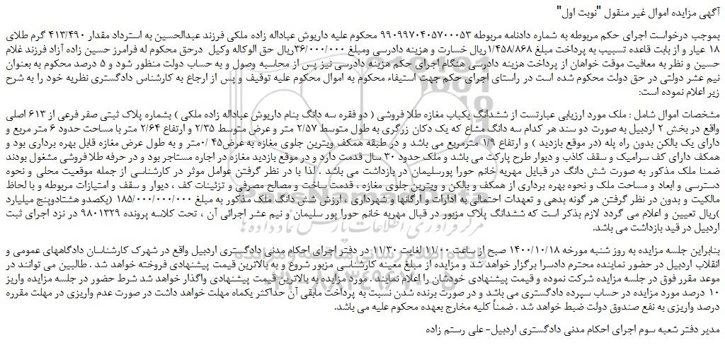مزایده،مزایده فروش  ششدانگ یکباب مغازه طلا فروشی