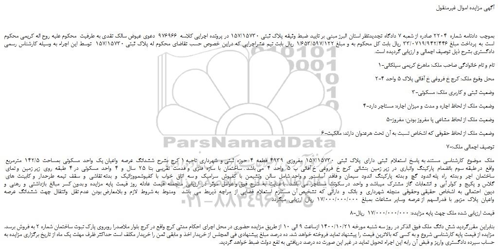 ملک موضوع کارشناسی مستند به پاسخ استعلام ثبتی دارای پلاک ثبتی 157/15730 مفروزی 4939 قطعه 4 حوزه ثبتی و شهرداری ناحیه 1 کرج بشرح ششدانگ عرصه واعیان یک واحد مسکونی بمساحت 142/5 مترمربع واقع در طبقه سوم بانضمام پارکینگ وانباری در زیر زمین بنشانی کرج خ فروغی خ آقائی پ 5 واحد 4 می باشد . ساختمان با سازه فلزی و قدمت تقریبی بنا 25 سال و 4 واحد مسکونی در 4 طبقه روی زیر زمین و نمای ساختمان اجر و بدنه راه پله اندود گچ و بدنه پارکینگ اندود سیمان و فاقد آساسنور و واحد شامل سالن ونشیمن با کفپوش سرامیک و سه اتاق خواب با کفپوشمووزائیک و بدنه نقاشی و سقف نیمه طرحدار و کابینت های گلاس و پکیج و کولر آبی و انشعابات گاز مشترک میباشد و واحد در سکونت مستاجر می باشد . با عنایت به شرح فوق و عوامل موثر در ارزیابی منجمله قیمت عادله روز قیمت پایه مزایده و بدون کسر مبالغ بازداشتی و رهنی و دیون احتمالی به اشخاص حقیقی وحقوقی منجله شهرداری و بانک و دارائی که تشخیص آن مستلزم استعلام قضایی از مراجه ذیربط می باشد ومنوط به شروط لازم و بلامعارض بودن عدم نقل وانتقال جهت ششدانگ عرصه واعیان پلاک مزبور با قدرالسهم از عرصه وسایر مشاعات بمبلغ 17/000/000/000 ریال ارزیابی میگردد