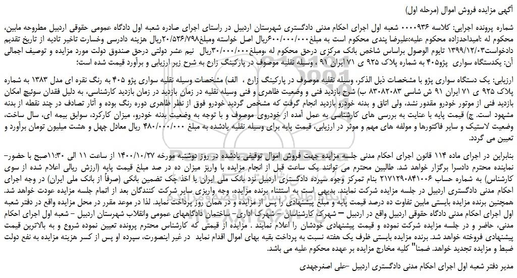شماره پرونده اجرایی: کلاسه 0000936 شعبه اول اجرای احکام مدنی دادگستری شهرستان اردبیل در راستای اجرای صادره شعبه اول دادگاه عمومی حقوقی اردبیل مطروحه مابین، محکوم له :امیداحدزاده محکوم علیه:علیرضا پندی محکوم است به مبلغ600/000/000ریال اصل خواسته ومبلغ20/526/798ریال هزینه دادرسی وخسارت تاخیر تادیه از تاریخ تقدیم دادخواست1399/12/03 تایوم الوصول براساس شاخص بانک مرکزی درحق محکوم له ،ومبلغ30/000/000ریال  نیم عشر دولتی درحق صندوق دولت مورد مزایده و توصیف اجمالی آن: یکدستگاه سواری  پژو405 به شماره پلاک 925 ی 71 ایران 91 ، وسیله نقلیه موصوف در پارکینگ زارع به شرح زیر ارزیابی و برآورد قیمت شده است؛