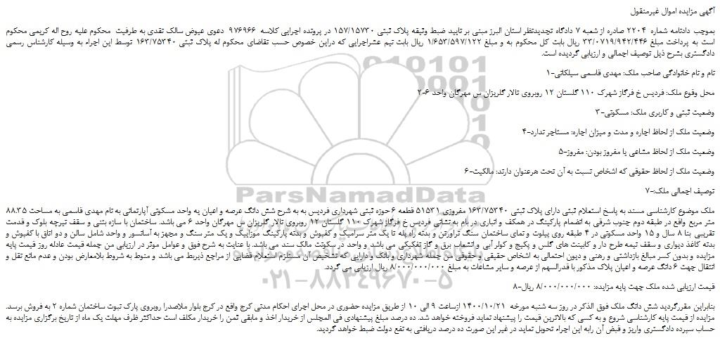 بموجب دادنامه شماره 2204 صادره از شعبه 7 دادگاه تجدیدنظر استان البرز مبنی بر تایید ضبط وثیقه پلاک ثبتی 157/15730 در پرونده اجرایی کلاسه 976966 دعوی عیوض سالک نقدی به طرفیت محکوم علیه روح اله کریمی محکوم است به پرداخت مبلغ 33/0719/942/446 ریال بابت کل محکوم به و مبلغ 1/653/597/122 ریال بابت نیم عشراجرایی که دراین خصوص حسب تقاضای محکوم له پلاک ثبتی 163/75340 توسط این اجراء به وسیله کارشناس رسمی دادگستری بشرح ذیل توصیف اجمالی و ارزیابی گردیده است.
