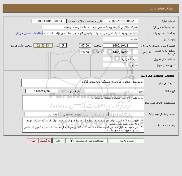 نام دستگاه خریدار:شرکت پالایش گاز شهید هاشمی نژاد استان خراسان رضوی