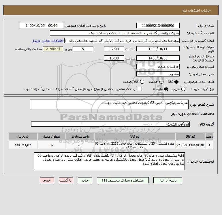 نام دستگاه خریدار:شرکت پالایش گاز شهید هاشمی نژاد استان خراسان رضوی