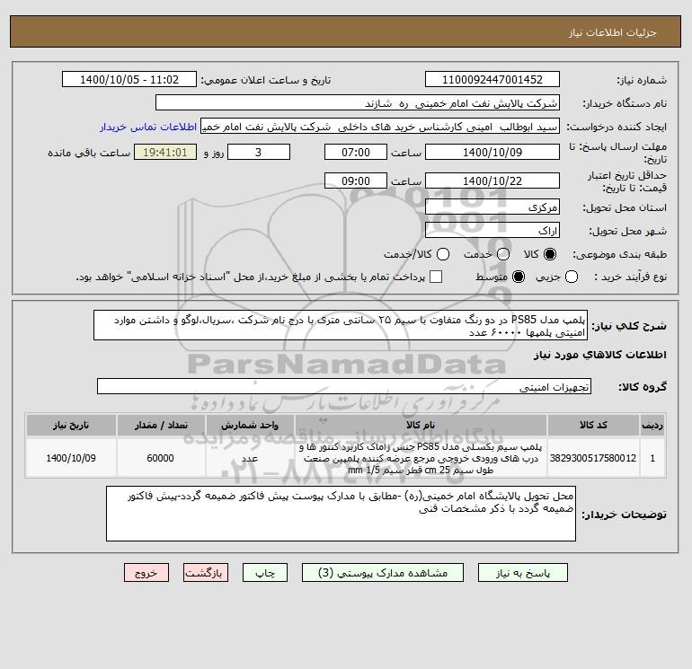 شرح کلی نیاز: پلمپ مدل PS85 در دو رنگ متفاوت با سیم ۲۵ سانتی متری با درج نام شرکت ،سریال،لوگو و داشتن موارد امنیتی پلمپها ۶۰۰۰۰ عدد