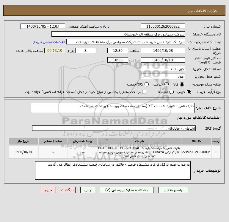 شرح کلی نیاز: باتری تلفن ماهواره ای مدل XT (مطابق مشخصات پیوست) پرداخت غیر نقدی