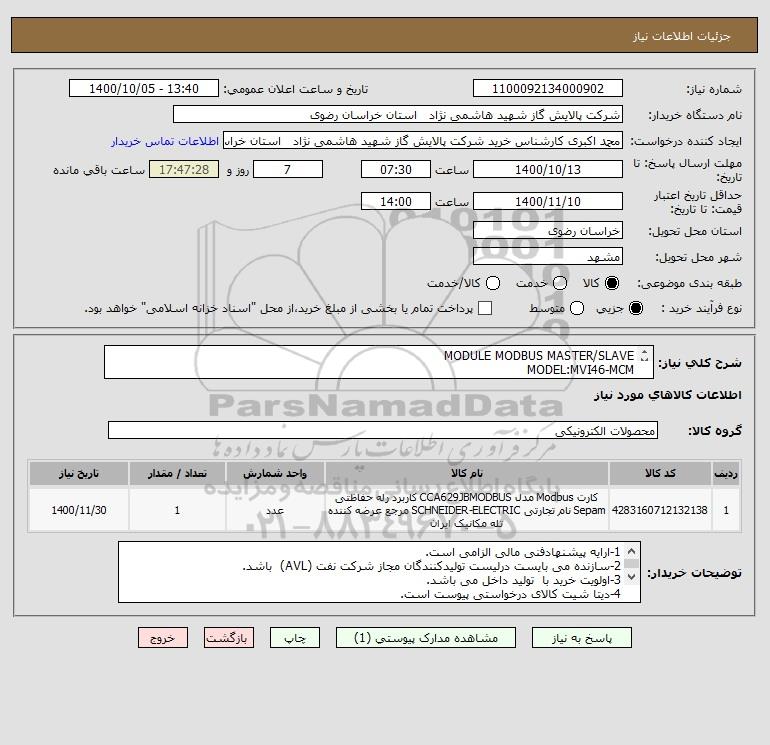 نام دستگاه خریدار:شرکت پالایش گاز شهید هاشمی نژاد استان خراسان رضوی