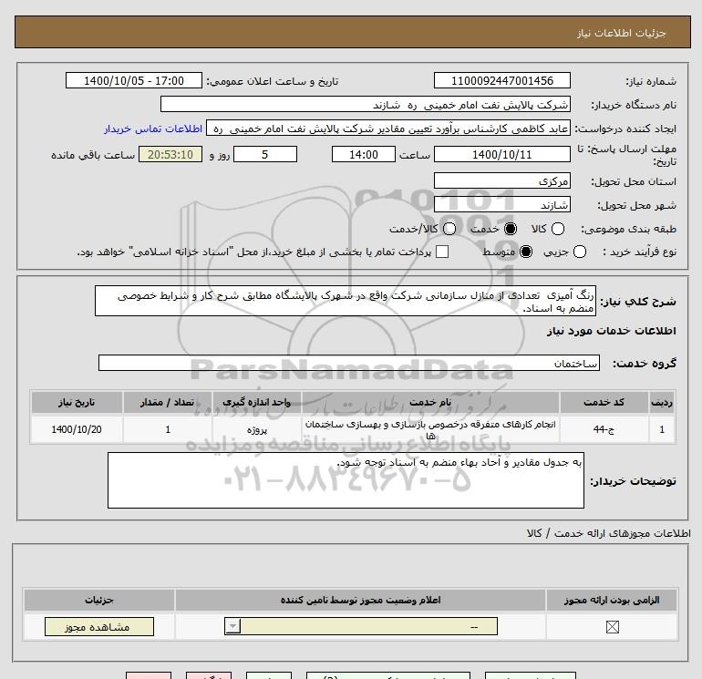 شرح کلی نیاز: رنگ آمیزی تعدادی از منازل سازمانی شرکت واقع در شهرک پالایشگاه مطابق شرح کار و شرایط خصوصی منضم به اسناد.