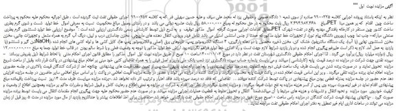 نظر به اینکه باستناد پرونده اجرایی کلاسه 9900225 صادره از سوی شعبه 1 دادگاه عمومی و حقوقی یزد له محمد علی سیاف و علیه حسین سهیلی فر که به کلاسه 9900257 اجرای حقوقی تفت ثبت گردیده است ، طبق اجرائیه محکوم علیه محکوم به پرداخت مبلغ 2.494.982.468 ریال بابت محکوم به در حق محکوم له ومبلغ 58.000.000 ریال بابت عشریه دولتی می باشد و در راستای وصول مبالغ محکومیت نسبت به معرفی اموال خط تولید شست و شوی گرم بطری PET ساخت چین اقدام که بر همین مبنا مطابق اقدامات اجرایی صورت گرفته اموال مذکور توقیف و به شرح ذیل توسط کارشناس رسمی دادگستری ارزیابی شده است :" موضوع ارزیابی خط تولید شستشوی گرم بطری PET ساخت کشور چین مستقر در کارخانه بافندگی مهدیه واقع در تفت- شهرک صنعتی مبارکه- جنب نما چوب (روبروی دانشگاه پیام نور)، از تجهیزات خط تولید مذکور که عمدتا از جنس استنلس استیل می باشد شامل فیدر ورودی، انتقال دهنده های مارپیچی، مخزن جداسازی درب و لیبل، دیگ آب گرم به همراه مشعل و تجهیزات جانبی، مخزن شن گیر و شستشو (با NaOH)، مخزن شستشوی نهایی (با آب)، یک دستگاه سانتریفوژ، خشک کن، مخزن ذخیره محصول با دو دهانه بارگیری، 4 دستگاه الکتروموتور پمپ، تابلوهای برق (اصلی و الکتروموتور پمپ ها)، کابل کشی ها و لوله کشی های انجام شده بازدید به عمل آمد. لازم به ذکر است علیرغم پیگیری انجام شده و دو بار بازدید شرایط لازم جهت تست و راه اندازی خط تولید فراهم نگردیده بود. ارزش خط تولید مذکور با توجه به وضعیت فعلی و با شرط سالم بودن در قالب خط تولید جمعا به مبلغ 12.000.000.000 ریال (دوازده میلیارد ریال) برآورد می گردد . لذا اجرای احکام حقوقی دادگستری شهرستان تفت در نظر دارد در مورخ 1400/11/02ساعت 10 صبح از طریق مزایده نوبت اول اموال مذکور را مطابق قانون اجرای احکام مدنی با لحاظ شرایط ذیل بفروش برساند: -سپرده نقدی جهت شرکت در مزایده ده درصد قیمت پایه (کارشناسی ) میباشد و می بایست بشماره حساب سپرده دادگستری نزد شعب بانک ملی واریز و اصل فیش را به همراه تقاضای کتبی خود مبنی بر اعلام مبلغ پیشنهادی در پاکت قرار داده وقبل از ساعت شروع مزایده تحویل نمایند و در صورت برنده شدن می بایست ظرف یک ساعت فیش دوم مابه التفاوت ده درصد مبلغ پیشنهادی را به اجرا ارائه نماید بدیهی است پس از تعیین سقف قیمت های پیشنهادی چنانچه احد از شرکت کنندگان قیمت بالاتری در جلسه حضوری مزایده اعلام نماید برنده مزایده تلقی میگردد . و بر این اساس قیمت اعلام شده در پاکت قیمت پایه محسوب میگردد. و شرکت کننده در مزایده می تواند با حضور در جلسه مزایده قیمت اعلامی در پاکت را بر اساس مبلغ اعلامی سایر حاضرین در جلسه مزایده افزایش دهد عدم حضور در جلسه مزایده بمنزله قطعی بودن مبلغ پیشنهادی در پاکت توسط شرکت کننده میباشد . . تقاضایی که فاقد ده درصد سپرده باشد فاقد اعتبار و ترتیب اثر داده نخواهد شد .-برنده مزایده میبایست ظرف مدت 14روز نسبت بپرداخت باقیمانده مبلغ پیشنهادی اقدام نماید در غیر اینصورت سپرده وی پس از کسر هزینه مزایده به نفع دولت ضبط میگردد . و مزایده تجدید میگردد.-از نظر اجرا اقدام به شرکت در مزایده به معنی اطلاع و رعایت کامل و قبول شرایط و مقررات حاکم بر مزایده وهمچنین اطلاع از وضعیت و کیفیت خودروی مورد مزایده و نحوه انتقال و تشریفات و هزینه های مرتبط با آن میباشد.ضمنا" انتقال و تحویل منوط به قطعیت عملیات اجرایی مزایده میباشد .و در صورت عدم حضور محکوم علیه جهت پیگیری انجام مقدمات انتقال می بایست توسط برنده مزایده صورت گیرد . -پاکتهای پیشنهاد قیمت شرکت کنندگان در مزایده راس ساعت 10صبح مورخ فوق در محل دفتر اجرای احکام حقوقی تفت بازگشایی خواهد شد.-متقاضیان برای اخذ اطلاعات بیشتر یا عنداللزوم بازدید از مال مورد مزایده در مدت 5 روز قبل از زمان مزایده می توانند در ساعات اداری ایام غیر تعطیل به دفتر اجرای احکام حقوقی تفت مراجعه نمایند .