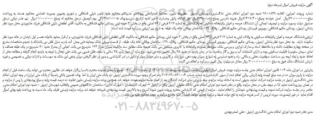 شماره پرونده اجرایی: کلاسه 9901849 شعبه دوم اجرای احکام مدنی دادگستری شهرستان اردبیل مطروحه مابین، محکوم له:مرادعلی پیچکانلو حسینکلو محکوم علیه :ناصر دلیلی قشلاقی و شهروز یحیوی بصورت تضامنی محکوم هستند به پرداخت مبلغ220/000/000ریال اصل خواسته ومبلغ7/419/400ریال هزینه دادرسی ومبلغ6/480/000ریال حق الوکاله وکیل وخسارت تاخیر تادیه ازتاریخ سررسیدچک 1398/11/05الی یوم الوصول درحق محکوم له ومبلغ 11/000/000ریال نیم عشر دولتی درحق صندوق دولت و،مورد مزایده و توصیف اجمالی آن: ششدانگ عرصه و اعیان یکبابخانه مسکونی به پلاک ثبتی به شماره 217 فرعی از76 اصلی واقع در بخش 3 حوزه ثبتی روستای حکیم قشلاقی به مالکیت آقای لطفعلی دلیلی قشلاقی فرزند خداویردی محل مورد نظر بنشانی اردبیل، روستای حکیم قشلاقی ،روبروی قبرستان روستای حکیم قشلاقی ، پلاک 129، ساختمان ویلائی خانه یک طبقه به شرح زیر ارزیابی و برآورد قیمت شده است؛