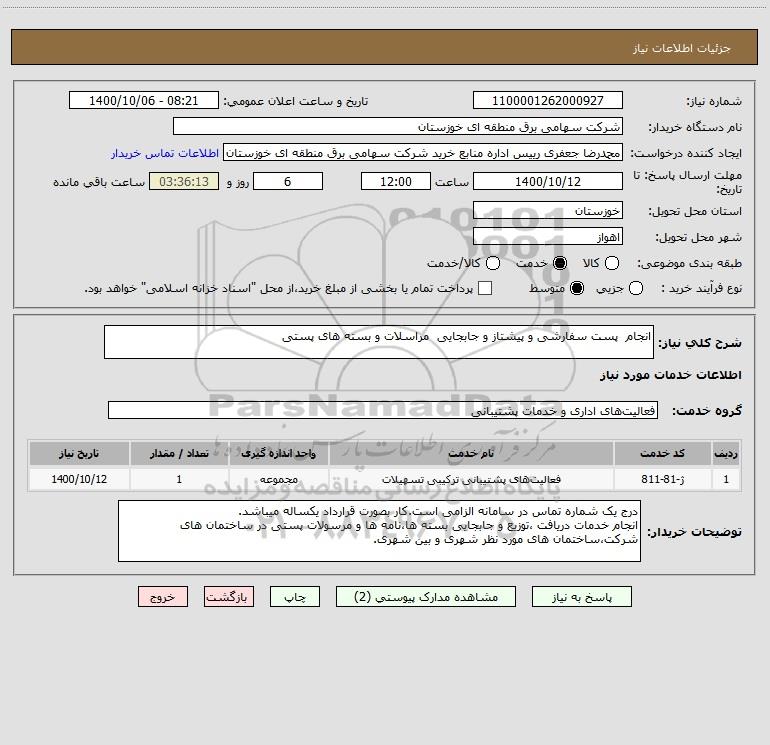 شرح کلی نیاز: انجام پست سفارشی و پیشتاز و جابجایی مراسلات و بسته های پستی