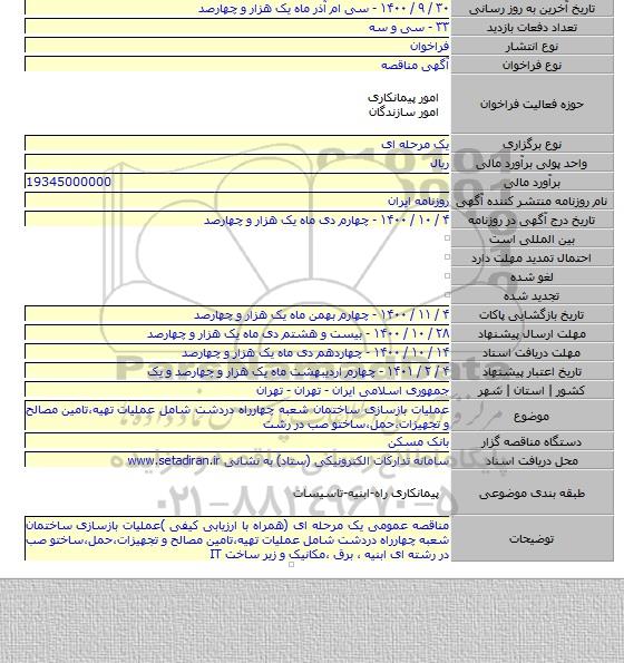 مناقصه عمومی یک مرحله ای (همراه با ارزیابی کیفی )عملیات بازسازی ساختمان شعبه چهارراه دردشت شامل عملیات تهیه٬تامین مصالح و تجهیزات٬حمل٬ساختو صب در رشته ای ابنیه ٬ برق ٬مکانیک و زیر ساخت IT