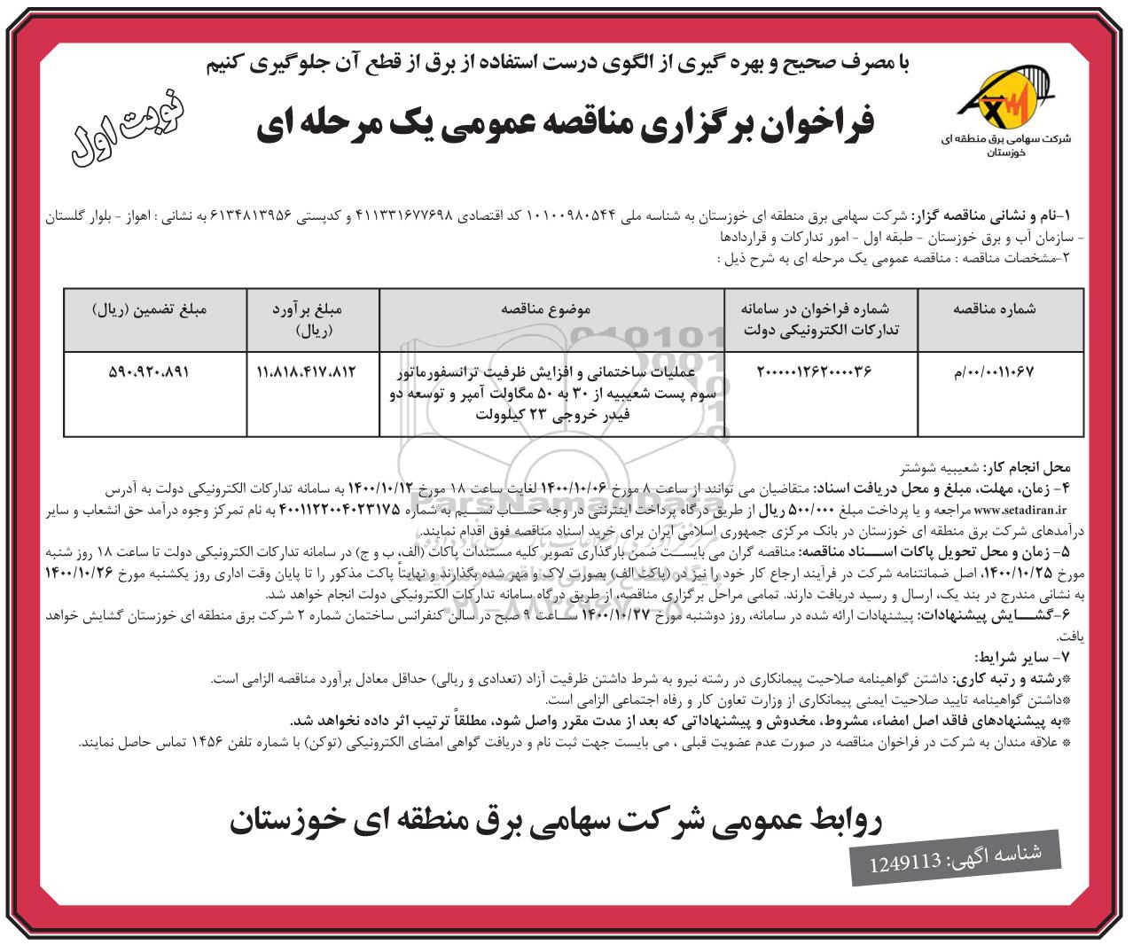 0011067/ 00/ م  2000001262000036 علمیات ساختمانی و افزایش ظرفیت ترانسفورماتور سوم پست شعیبیه از 30 به 50 مگاولت آمپر و توسعه دو فیدر خروجی 23 کیلوولت 11.818.417.812  590.920.891
