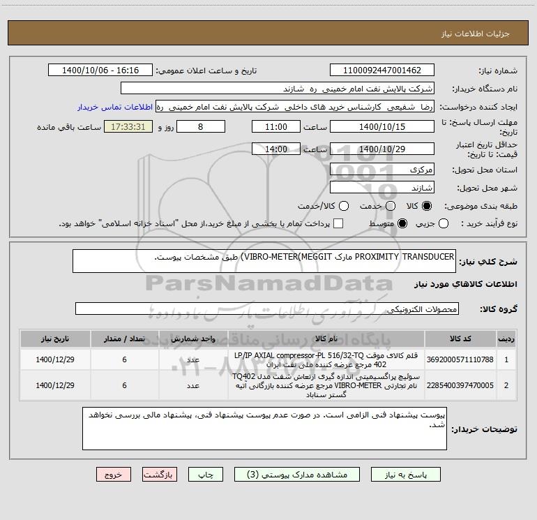 شرح کلی نیاز: PROXIMITY TRANSDUCER مارک VIBRO-METER(MEGGIT) طبق مشخصات پیوست.