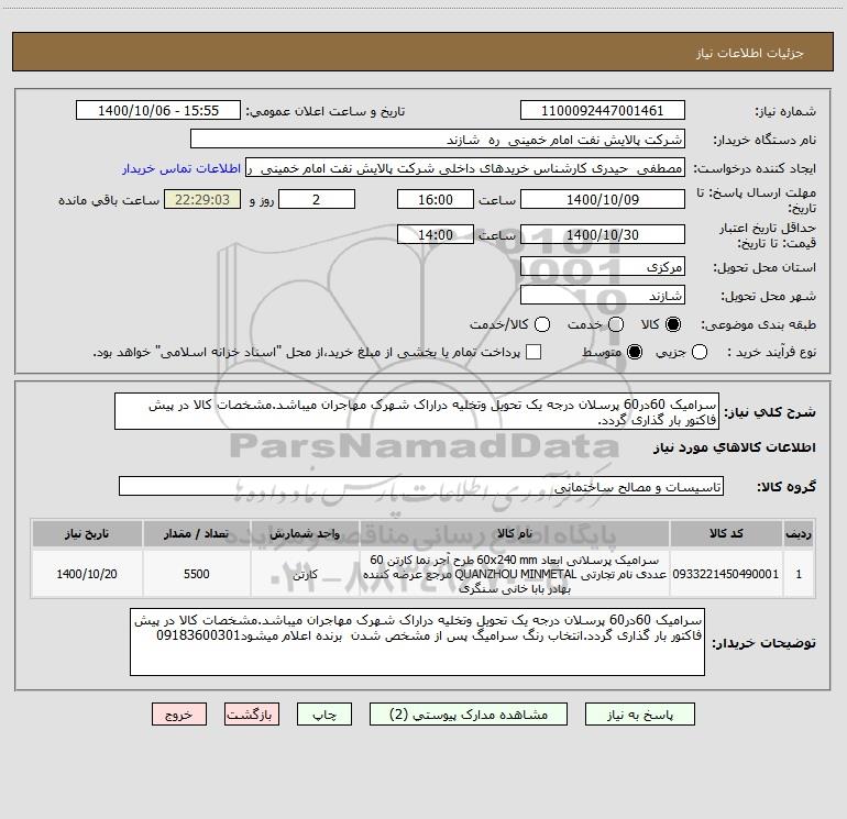 شرح کلی نیاز: سرامیک 60در60 پرسلان درجه یک تحویل وتخلیه دراراک شهرک مهاجران میباشد.مشخصات کالا در پیش فاکتور بار گذاری گردد.