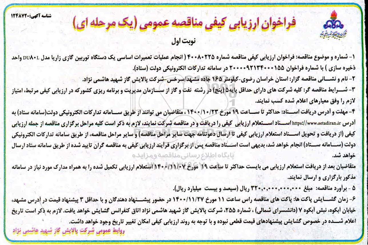 فراخوان ارزیابی کیفی مناقصه انجام عملیات تعمیرات اساسی یک دستگاه توربین گازی زاریا, مناقصه، فراخوان ارزیابی کیفی مناقصه انجام عملیات تعمیرات اساسی یک دستگاه توربین گازی زاریا