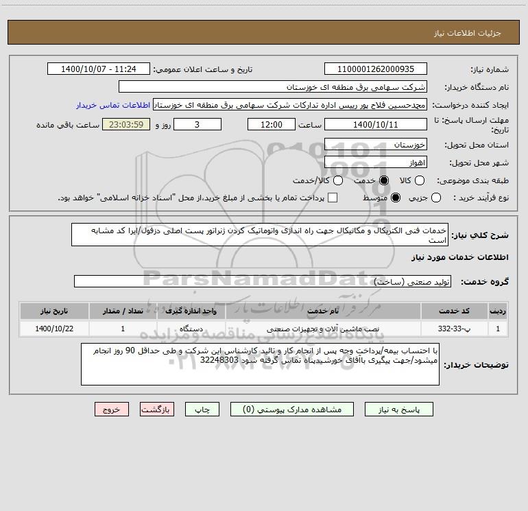 شرح کلی نیاز: خدمات فنی الکتریکال و مکانیکال جهت راه اندازی واتوماتیک کردن ژنراتور پست اصلی دزفول/ایرا کد مشابه است