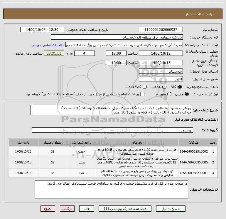 شرح کلی نیاز: پیراهن و شورت والیبالی با شماره و لوگوی شرکت برق منطقه ای خوزستان ( 18 دست )