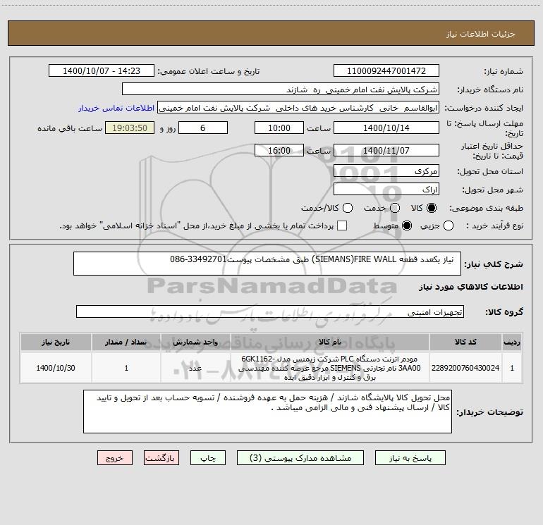 شرح کلی نیاز: نیاز یکعدد قطعه SIEMANS)FIRE WALL) طبق مشخصات پیوست33492701-086