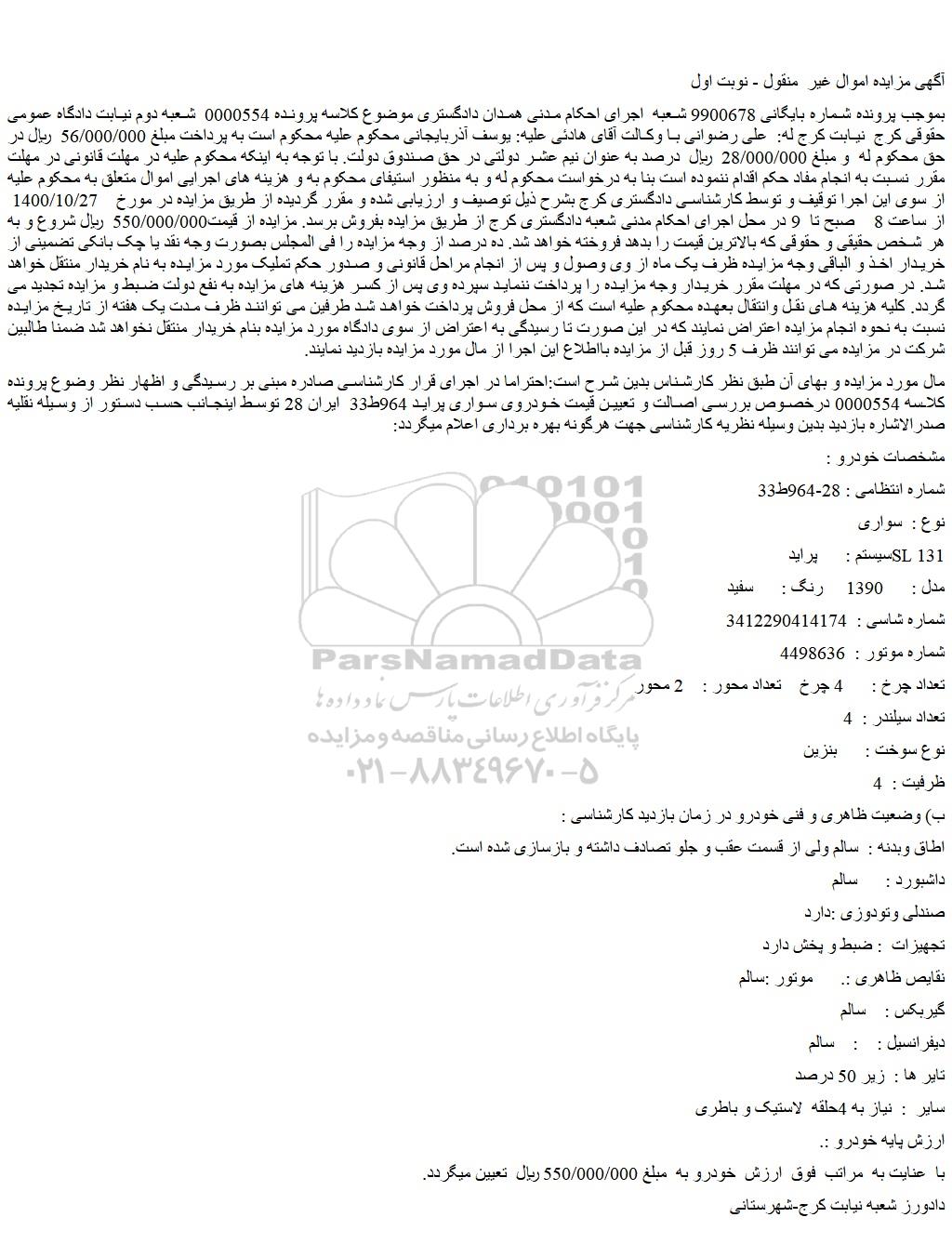 مال مورد مزایده و بهای آن طبق نظر کارشناس بدین شرح است:احتراما در اجرای قرار کارشناسی صادره مبنی بر رسیدگی و اظهار نظر وضوع پرونده کلاسه 0000554 درخصوص بررسی اصالت و تعیین قیمت خودروی سواری پراید 964ط33 ایران 28 توسط اینجانب حسب دستور از وسیله نقلیه صدرالاشاره بازدید بدین وسیله نظریه کارشناسی جهت هرگونه بهره برداری اعلام میگردد: